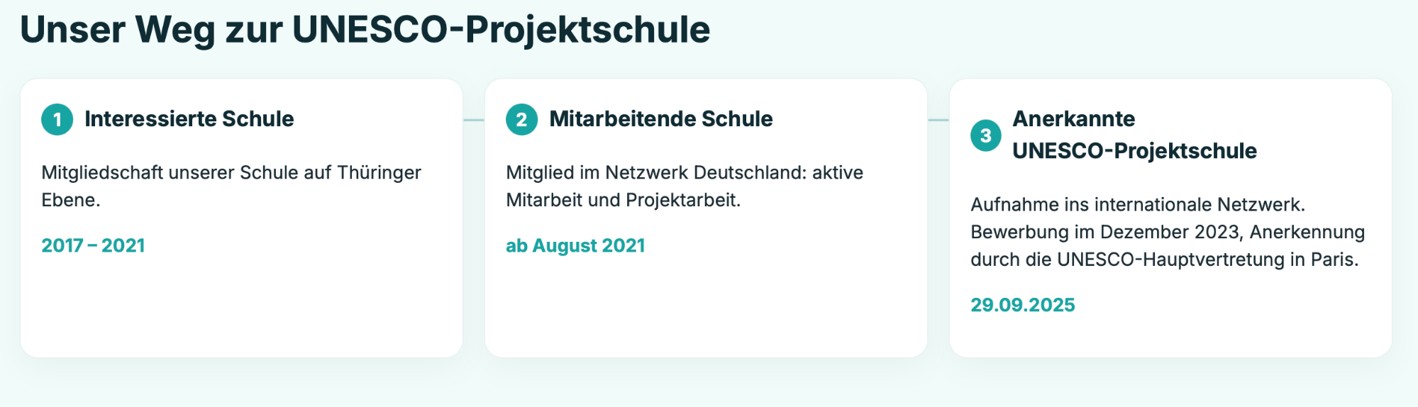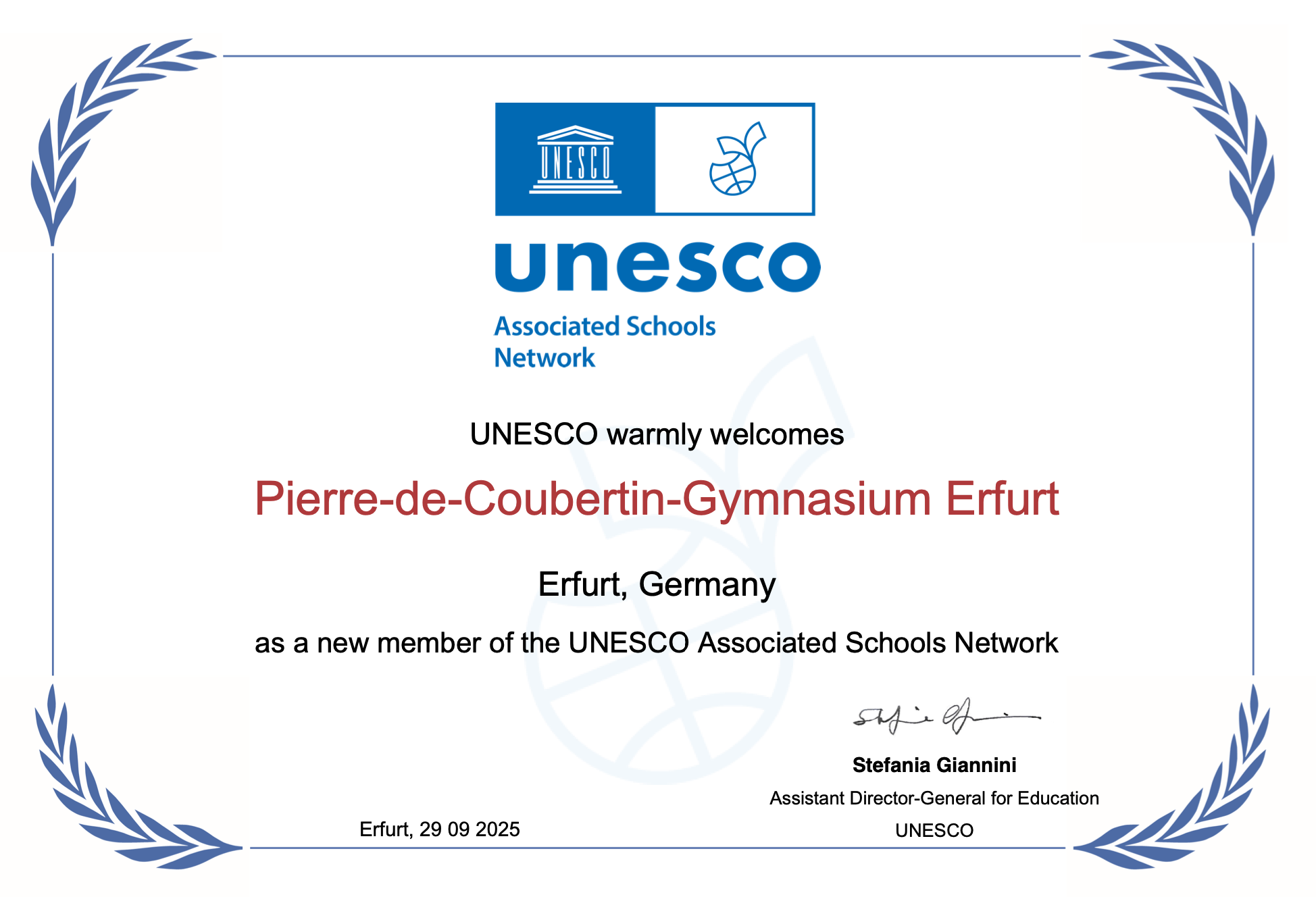 - Mit großer Freude erhielten wir von der UNESCO-Hauptvertretung in Paris die Nachricht, dass unsere Schule nun als „anerkannte UNESCO-Schule“ ins Weltnetzwerk der UNESCO-Schulen aufgenommen wurde!