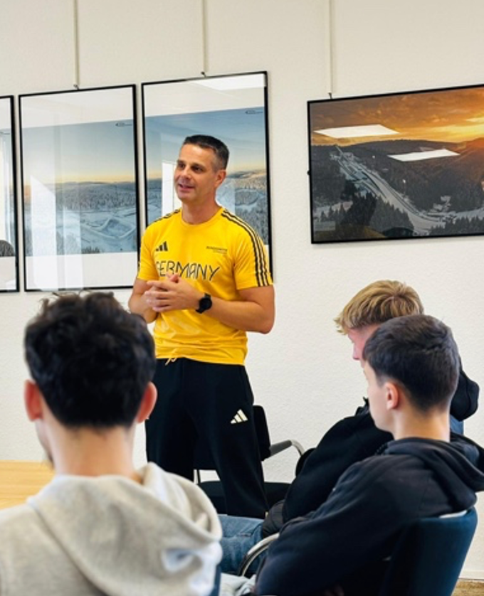 Der Tag zeigte, wie vielfältig die beruflichen Möglichkeiten im Bereich von Leistungssport und Bundeswehr sind. Man kann zum Beispiel als Sportsoldatin oder Sportsoldat, Trainerin oder Trainer, in der Sportwissenschaft und Datenanalyse, im Event- und Anlagenmanagement oder im Handwerk – etwa in der Büchsenmacherei oder Waffenmeisterei – tätig sein. Ein schönes Vorbild ist Finn Sonnekalb, ehemaliger Schüler und erfolgreicher Eisschnellläufer, der seinen sportlichen Weg inzwischen als Sportsoldat in Oberhof fortsetzt. Sein Werdegang zeigt exemplarisch, wie sich Sport und Beruf verbinden lassen.